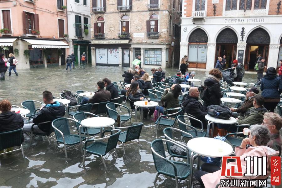 威尼斯水位再度触及1.5米 游客水中用餐沉船书店持续被淹