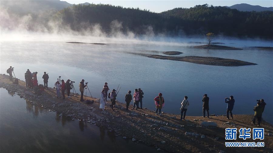 11月14日,游客在奇墅湖边拍摄风光。 初冬时节,安徽省黄山市黟县奇墅湖晨雾缥缈,别具韵味。新华社记者刘军喜摄