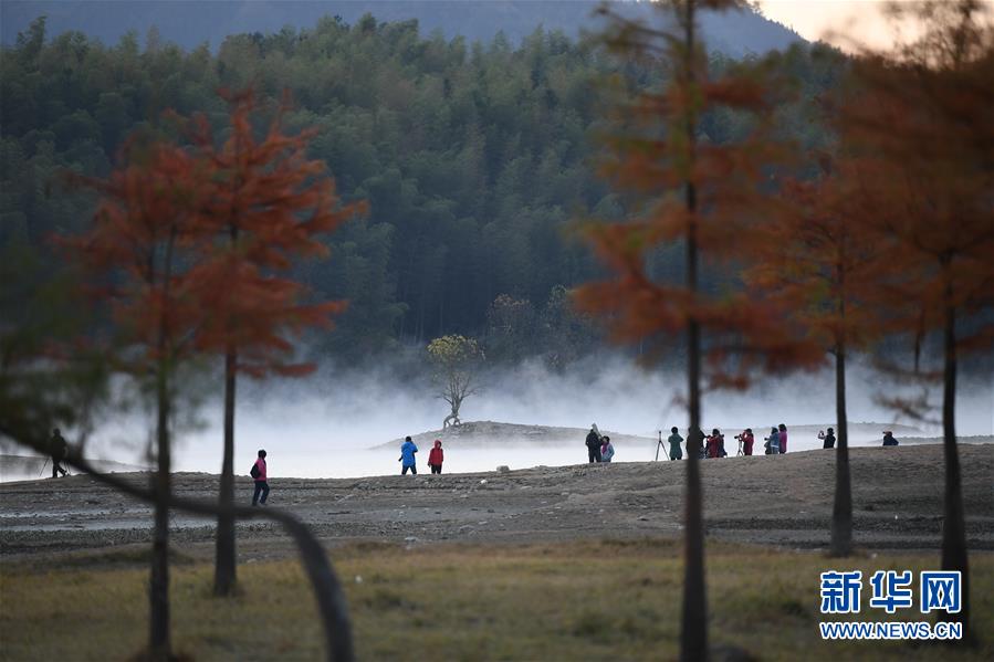 11月14日,游客在奇墅湖边拍摄风光。 初冬时节,安徽省黄山市黟县奇墅湖晨雾缥缈,别具韵味。新华社记者刘军喜摄