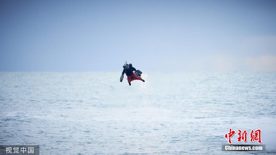 11月18日讯,英国布莱顿,英国发明家理查德·布朗宁穿着一套由身体控制、喷气发动机驱动、风力导向的飞行服,以高达每小时85.06英里(约137公里)的飞行速度,打破了自己创下的喷气式飞行服速度的吉尼斯世界纪录。图片来源:视觉中国