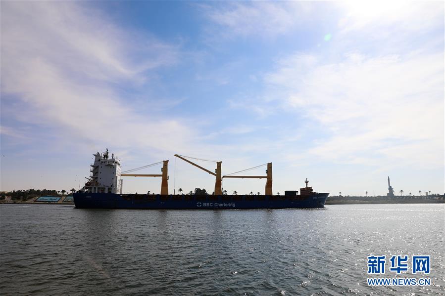 11月17日,在埃及伊斯梅利亚,一艘货轮从苏伊士运河上驶过。埃及苏伊士运河管理局17日在埃及东北部伊斯梅利亚省举行仪式,庆祝苏伊士运河通航150周年。新华社记者李碧念摄