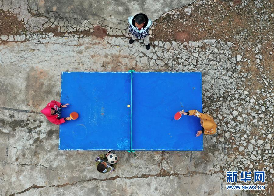 11月19日,在广西上思县那琴乡中心小学逢通村教学点,梁志雄教学生打乒乓球(无人机拍摄)。新华社记者陆波岸摄