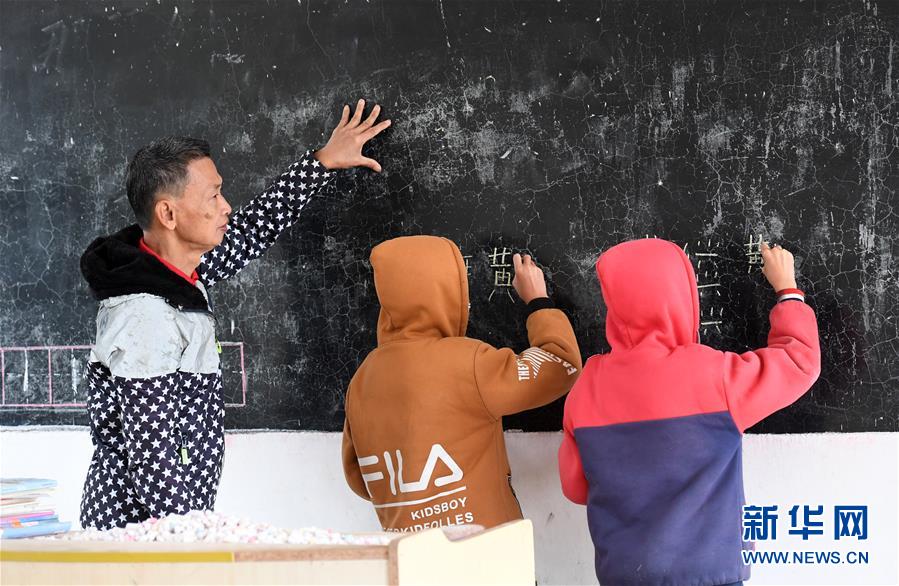 11月19日,在广西上思县那琴乡中心小学逢通村教学点,梁志雄教两名学生写字。新华社记者陆波岸摄