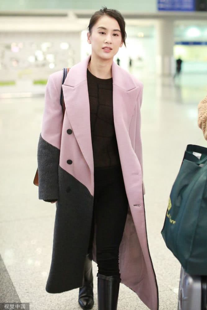 黄圣依穿拼色大衣。