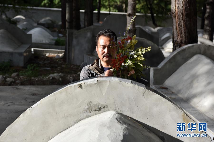 张建在西藏林芝市波密县烈士陵园祭拜父亲(8月29日摄)。新华社记者周锦帅摄