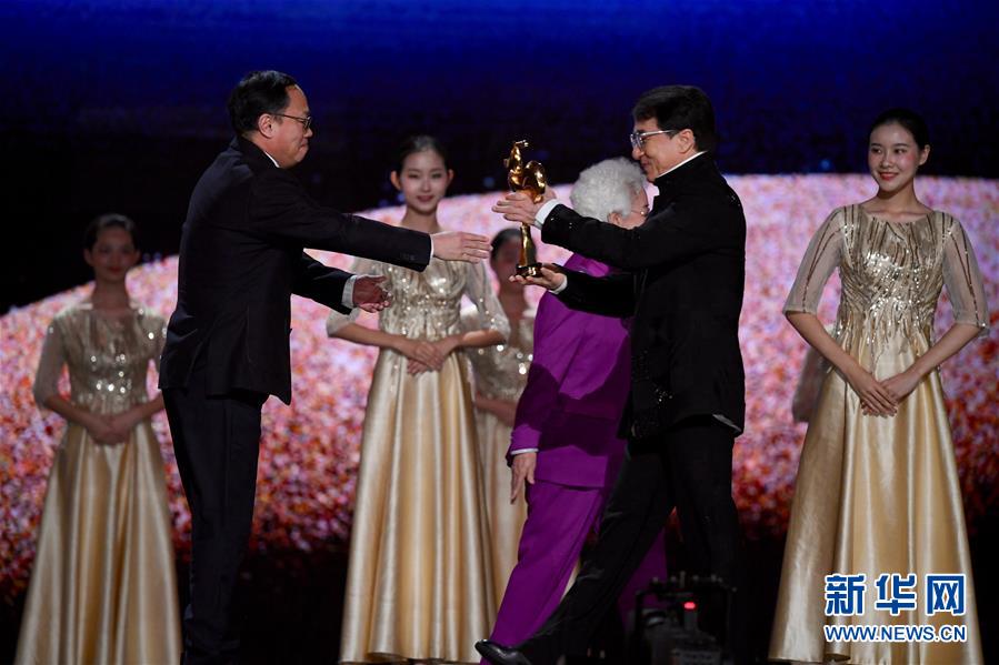 11月23日,电影《流浪地球》获得最佳故事片奖,成龙在为电影出品方代表颁奖。当日,第32届中国电影金鸡奖颁奖典礼在福建厦门举行。新华社记者姜克红摄