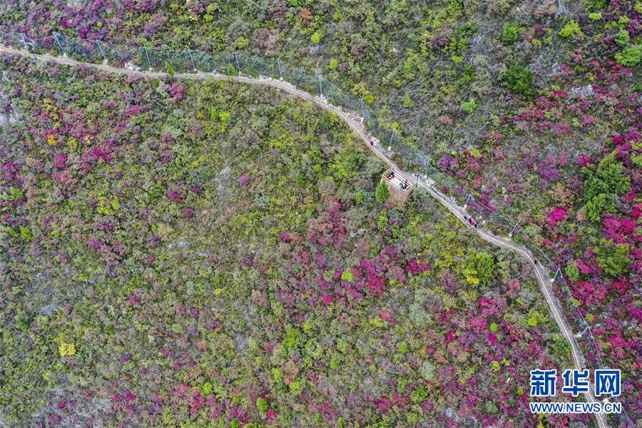 11月23日,游客在位于长江巫峡段的巫山文峰景区游览(无人机拍摄)。初冬时节,位于重庆巫山县境内的长江巫峡段呈现出一江碧水东流、两岸层林尽染的秀美景象。新华社记者王全超摄