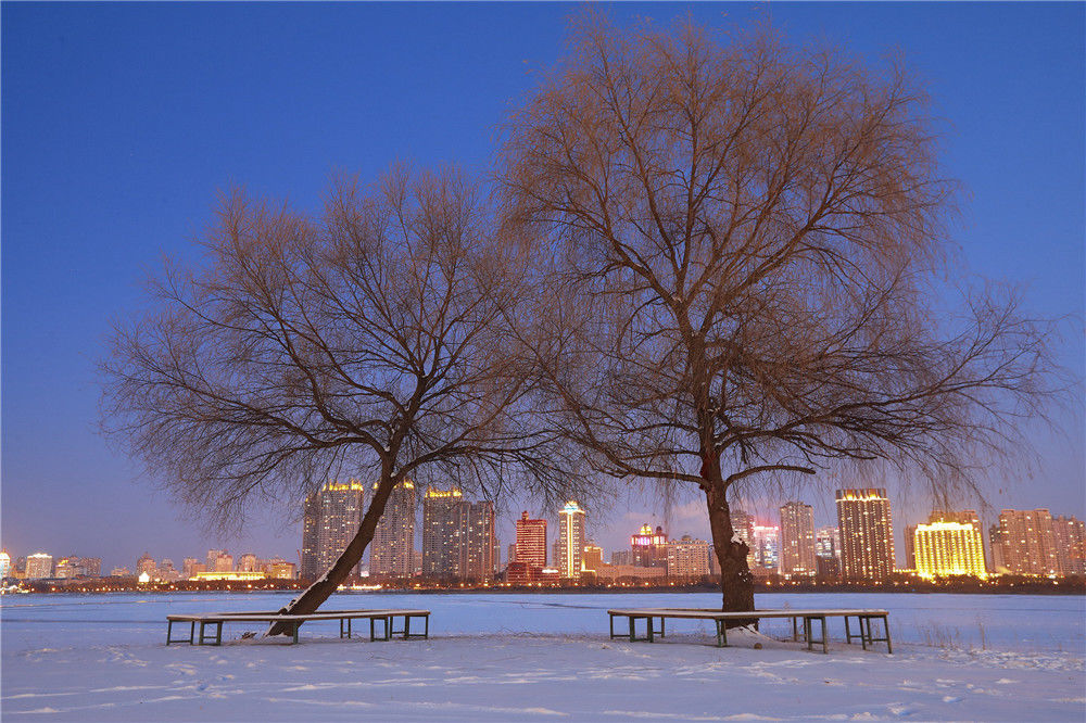 2019年11月19日,哈尔滨市,初冬时节,连续落雪,穿城而过的松花江,覆雪后晶莹如同玉带。岸边,有两棵盛年的大树,一棵矮些,依偎在另一棵粗壮的大树身上,如同情侣一般。