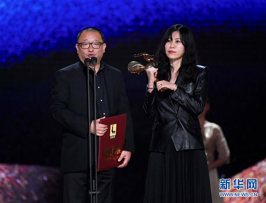 11月23日,电影《地久天长》获得最佳编剧奖,导演兼编剧王小帅(左)、编剧阿美在颁奖仪式上。 当日,第32届中国电影金鸡奖颁奖典礼在福建厦门举行。 新华社记者姜克红摄