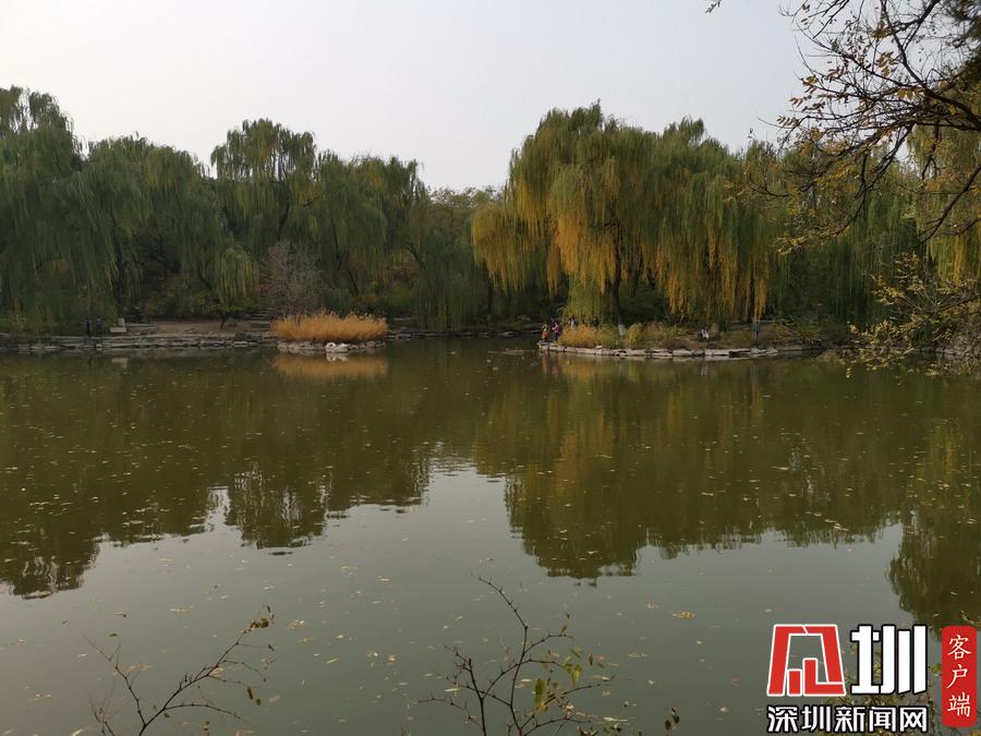 未名湖畔红叶多姿、美丽宁静。