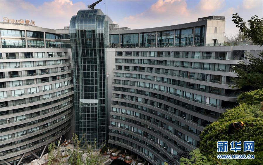 一名工人(右下)在位于酒店顶楼附近的崖壁上施工(11月13日摄)。新华社记者方喆摄