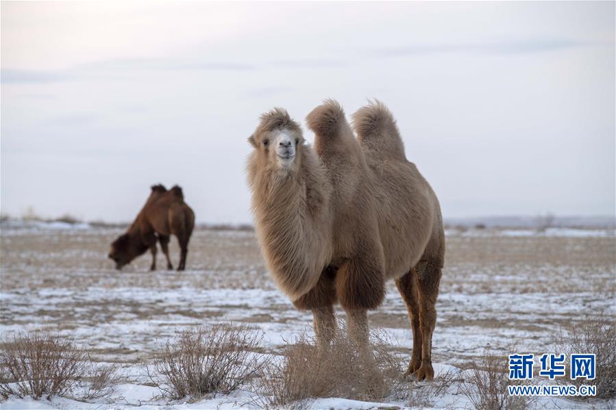 11月24日,两峰骆驼在新疆吉木乃县“万驼园”觅食。新华社记者沙达提摄