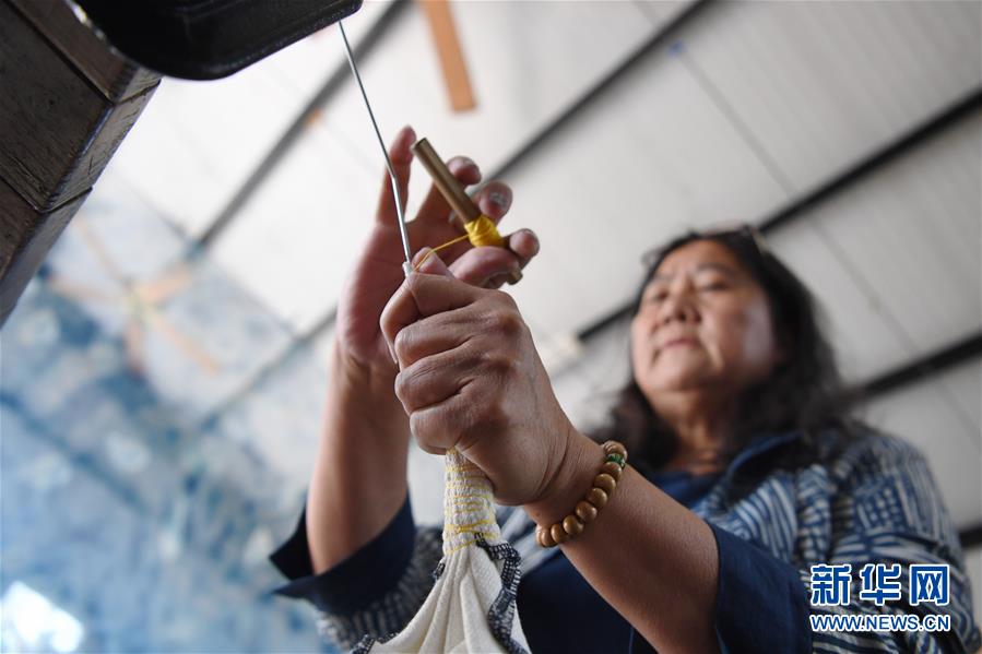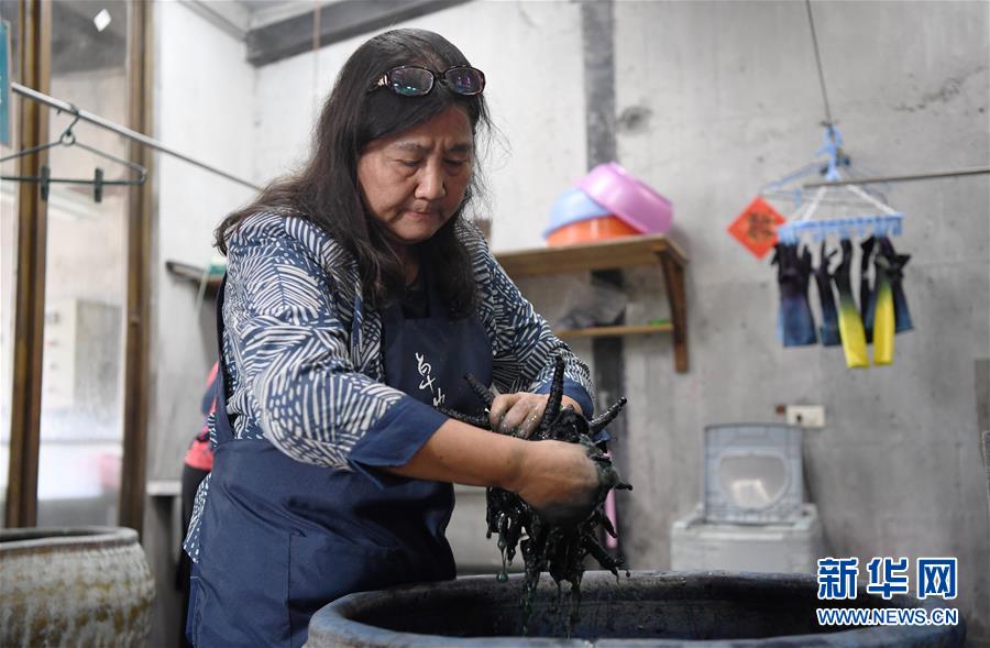 郑美淑在自己的染布工坊内制作蓝染作品(11月14日)。 新华社记者 陈斌 摄