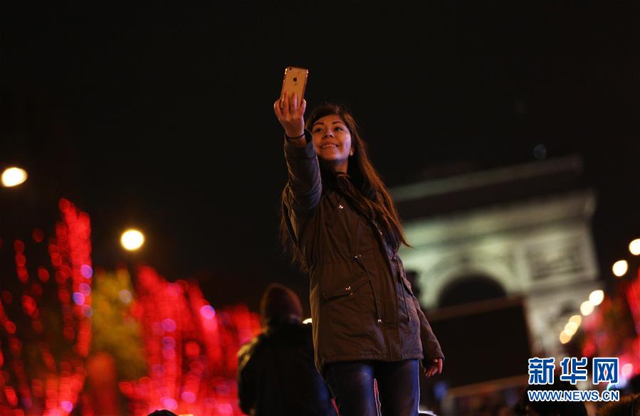 11月24日,在法国巴黎,一名女子在香榭丽舍大街点灯仪式上留影。当日,法国巴黎香榭丽舍大街点亮彩灯迎圣诞。从即日起至1月8日,整条香榭丽舍大街都将被喜庆的节日灯饰点亮。新华社记者高静摄