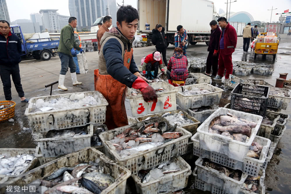 2019年11月24日,江苏连云港,渔民在连云区海棠渔港码头分拣搬运新鲜海产品。