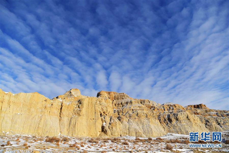 11月26日拍摄的新疆福海县乌伦古湖海上魔鬼城景区美景。福海县乌伦古湖海上魔鬼城景区位于新疆阿勒泰地区福海县吉力湖东岸,有着独特的雅丹地貌和水域景观,是当地著名的旅游胜地。新华社记者沙达提摄