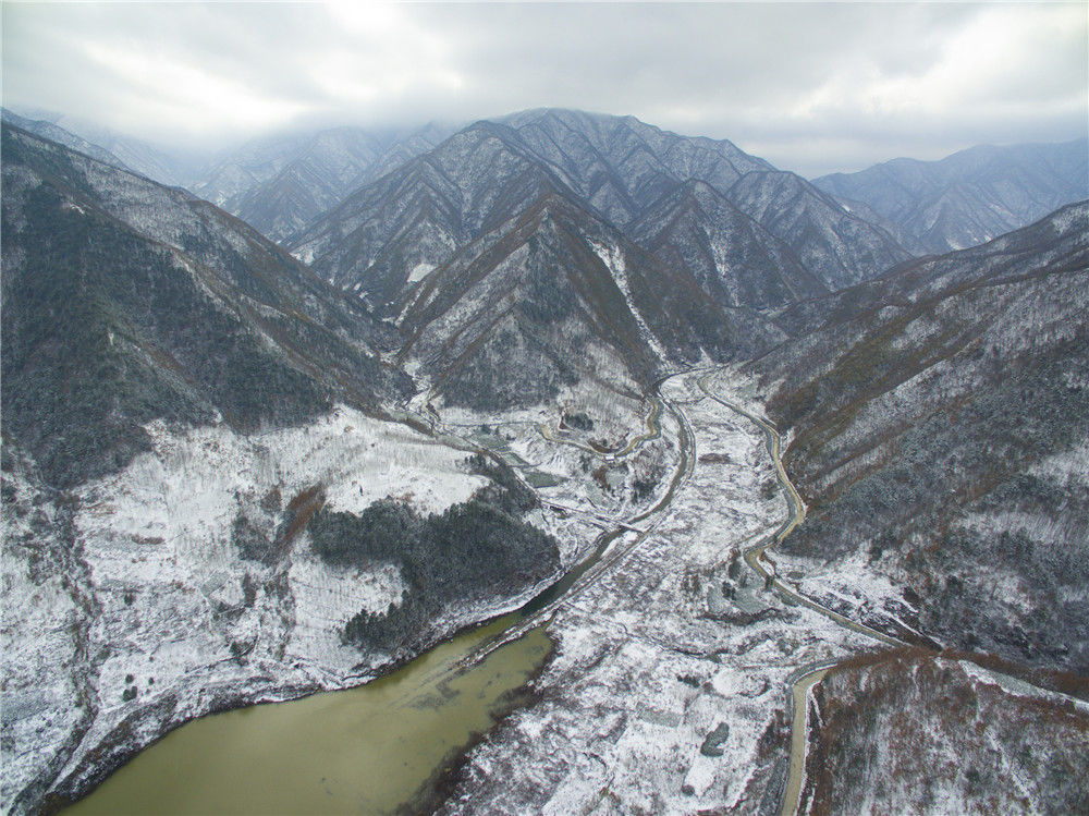 2019年11月25日,西安,蓝田县辋川镇前梁村,航拍雪后秦岭,放眼望去,高低起伏的山脉银装素裹,与淡绿色的库水构成一幅美妙的秦岭自然山水画。视觉中国