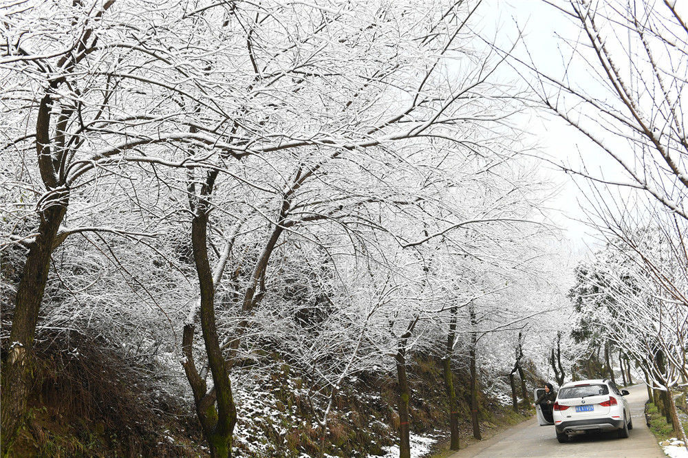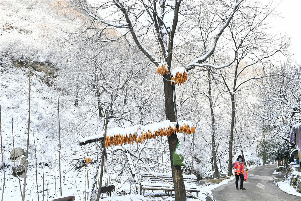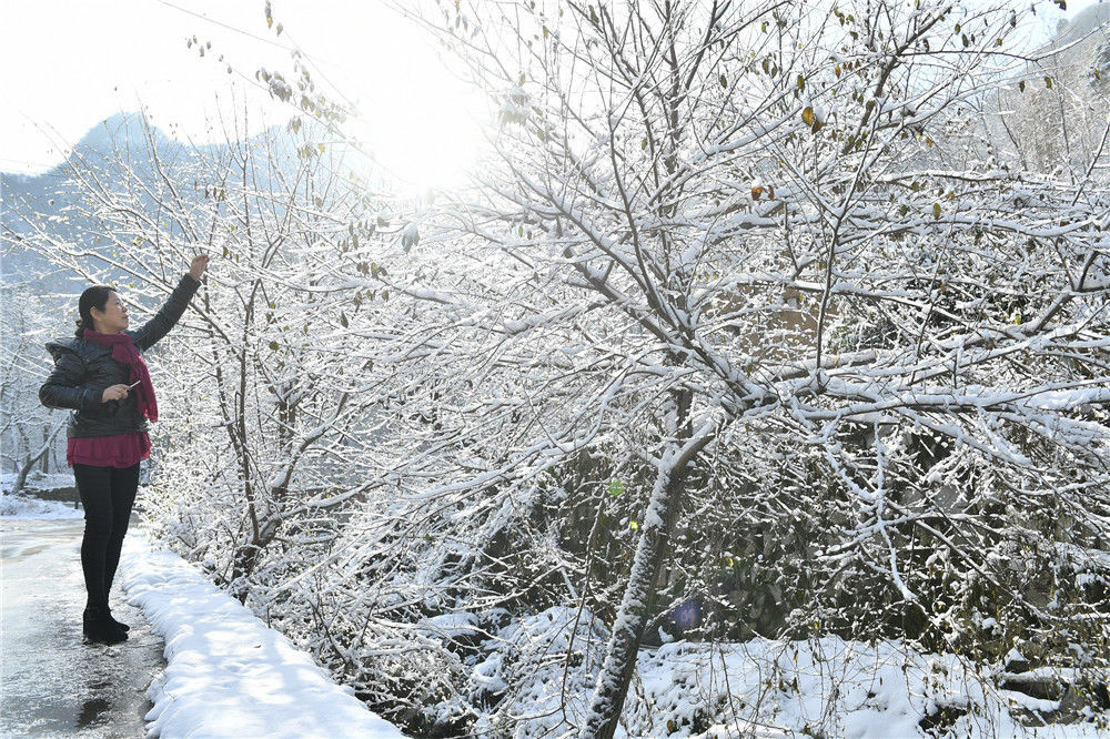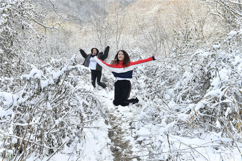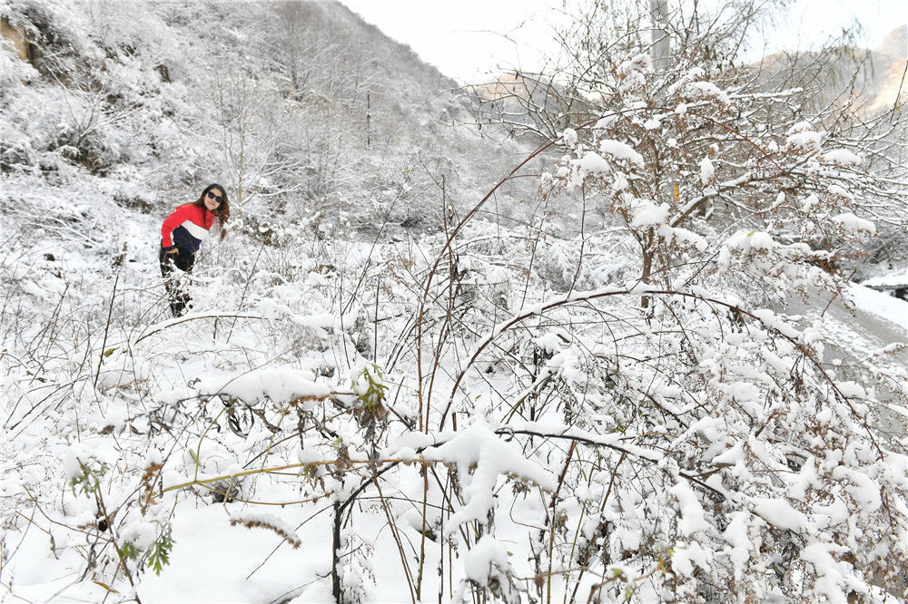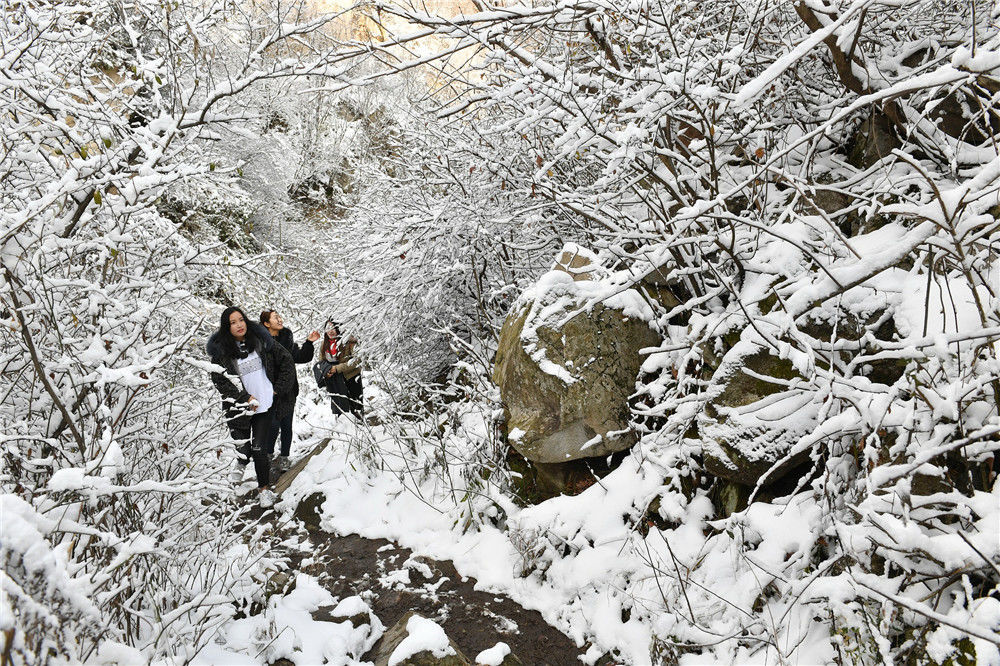 2019年11月25日,西安,市民在抱龙峪赏雪景。