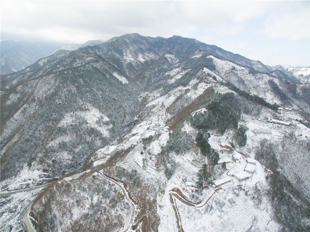 2019年11月25日,西安,蓝田县辋川镇前梁村,航拍雪后秦岭。