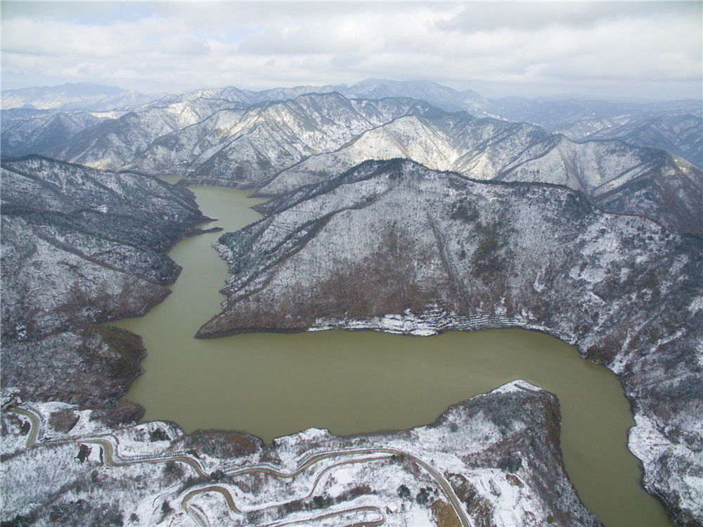 2019年11月25日,西安,蓝田县辋川镇前梁村,航拍雪后秦岭,放眼望去,高低起伏的山脉银装素裹,与淡绿色的库水构成一幅美妙的秦岭自然山水画。视觉中国