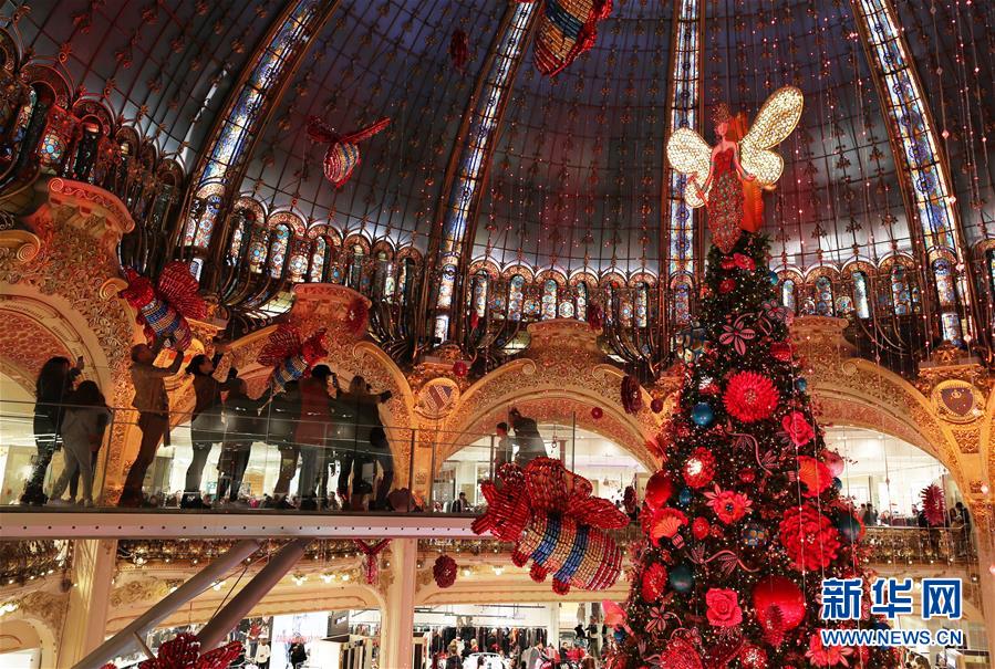 11月24日,在法国巴黎老佛爷百货公司,人们在玻璃走廊上参观点灯后的巨型圣诞树。 新华社记者高静摄