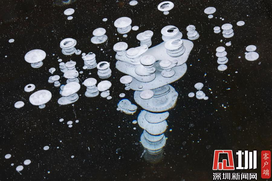 地处漠河市观音山景区的莲花湖湖面已经完全封冻,冰层最厚的地方已经超过60厘米,透过晶莹剔透的冰面可以看到一串串洁白的气泡分布在冰层之中,形成一组组惟妙惟肖的“冰泡”奇观。