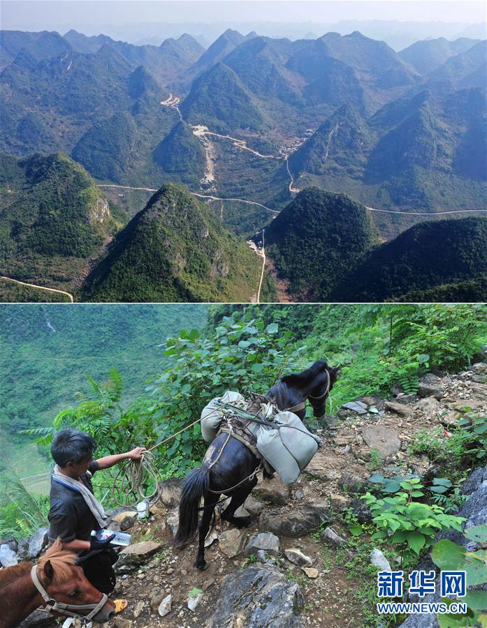 拼版照片:上图为已经修通公路的大化瑶族自治县板升乡弄勇村弄为屯以及周边村屯(11月11日无人机拍摄);下图为在弄勇村弄为屯,村民用马将建筑材料驮回家,用于修建新房(2014年6月18日摄)。