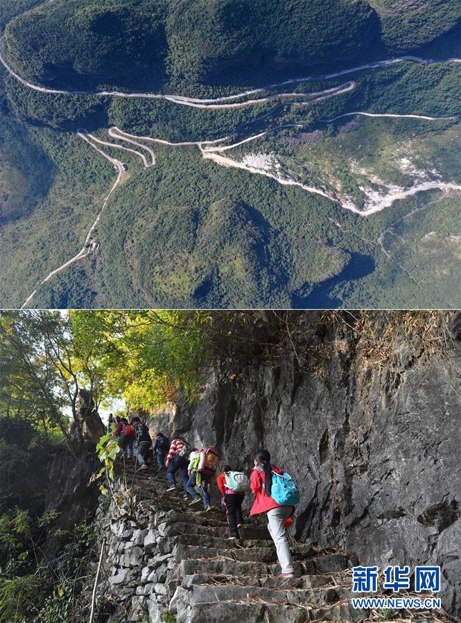 拼版照片:上图为大化瑶族自治县七百弄乡弄良村弄丘屯刚刚修通的公路(右下段)和村道、乡道连接(11月12日无人机拍摄);下图为在尚未通路的弄良村弄丘屯,孩子们爬“天梯”回家(2016年12月9日摄)。新华社记者黄孝邦摄