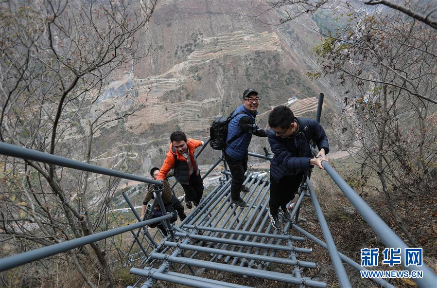 几名游客在通往阿土列尔村的钢梯上攀爬(11月23日摄)。新华社记者江宏景摄