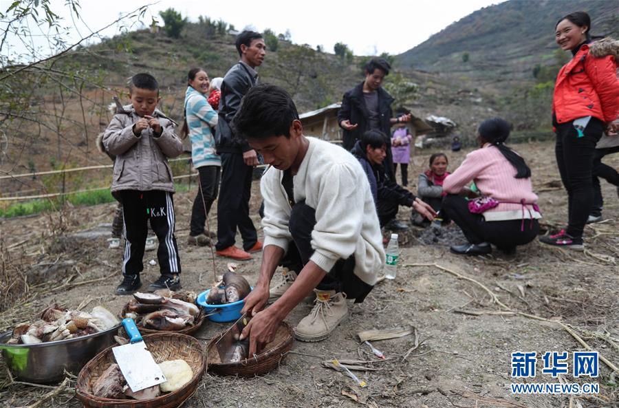 11月24日,在昭觉县支尔莫乡阿土列尔村,阿红在切煮熟的猪肉和羊肉,准备跟邻居分享。新华社记者江宏景摄