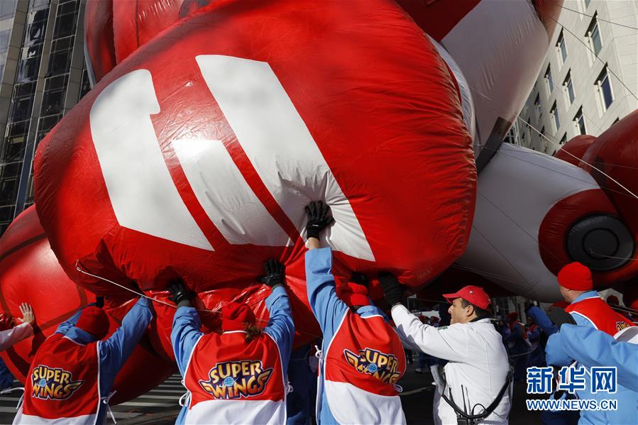 11月28日,在美国纽约举行的感恩节大游行上,卡通气球行进在曼哈顿街头。 新华社记者 李木子 摄