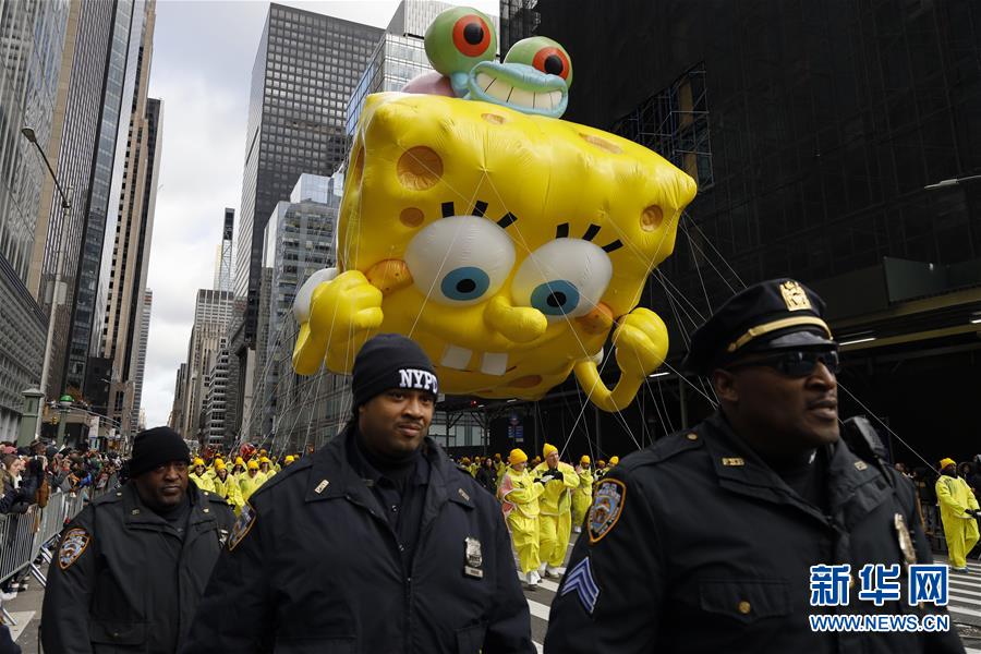 11月28日,在美国纽约举行的感恩节大游行上,卡通气球行进在曼哈顿街头。  新华社记者 李木子 摄