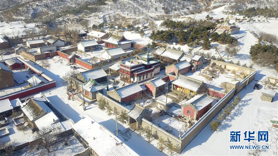 这是11月30日无人机拍摄的乌素图召雪景。11月29日,内蒙古呼和浩特市迎来降雪,位于呼和浩特市回民区境内的乌素图召,在瑞雪装点下呈现出银装素裹的美丽景观。新华社记者 彭源 摄