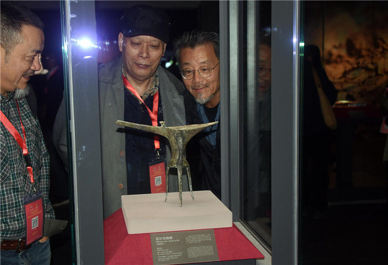 图为参加开馆仪式的专家学者参观“镇馆之宝”之一的乳钉纹铜爵酒礼器(夏,二里头文化四期)。