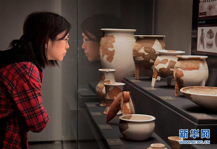 参观者在二里头夏都遗址博物馆内观看展出的陶器(10月19日摄)。新华社记者李安摄