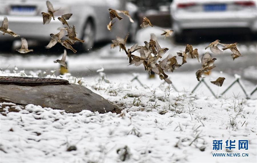 11月30日拍摄的在雪中觅食的麻雀。新华社记者李欣摄