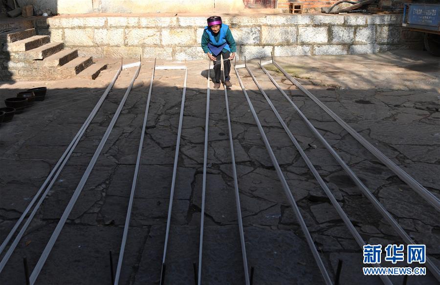 11月28日,75岁的大糯黑村村民毕秀珍在整理织麻布用的麻线。新华社记者周华摄