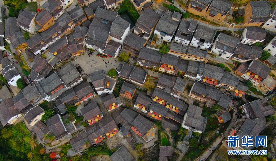 这是婺源县江湾镇篁岭村的晒秋景象(11月7日无人机拍摄)。新华社记者胡晨欢摄