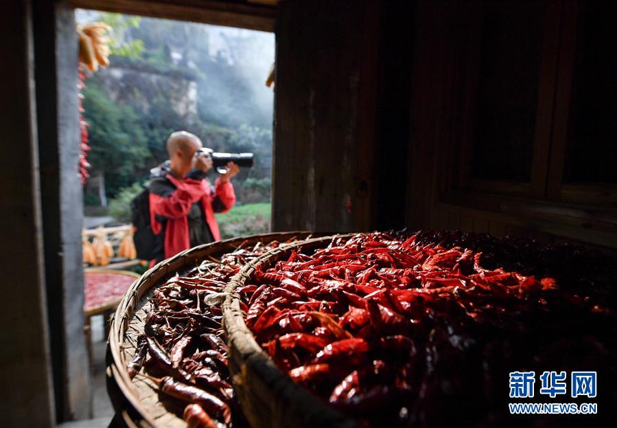 婺源县江湾镇篁岭村的居民在晾晒谷物(11月7日摄)。新华社记者胡晨欢摄