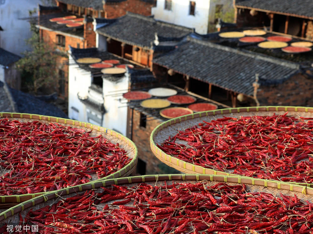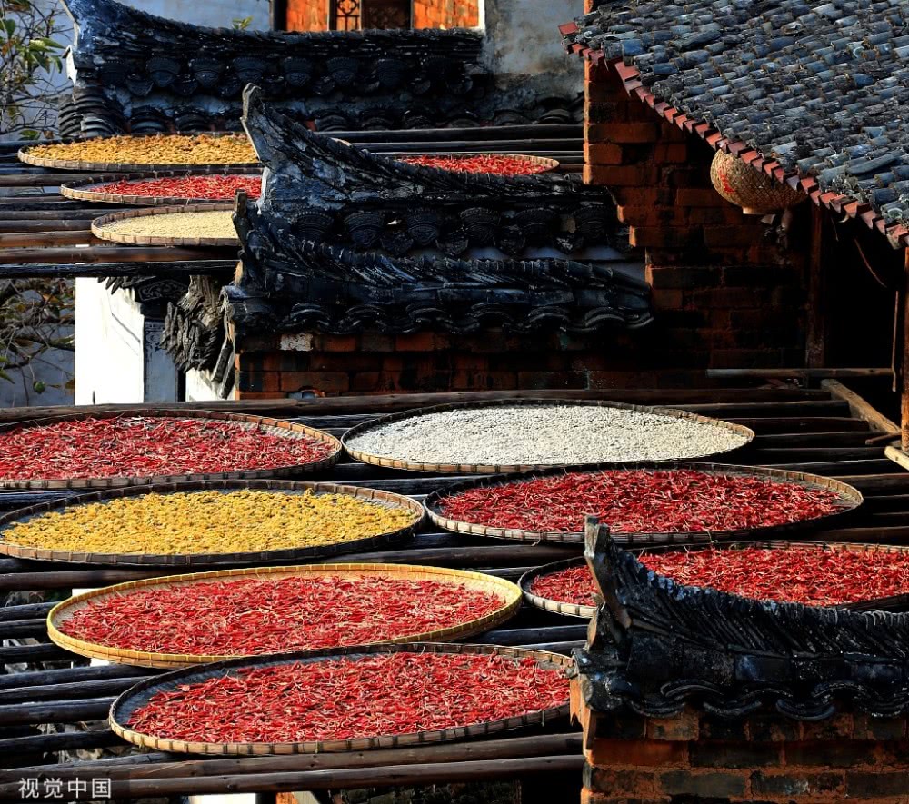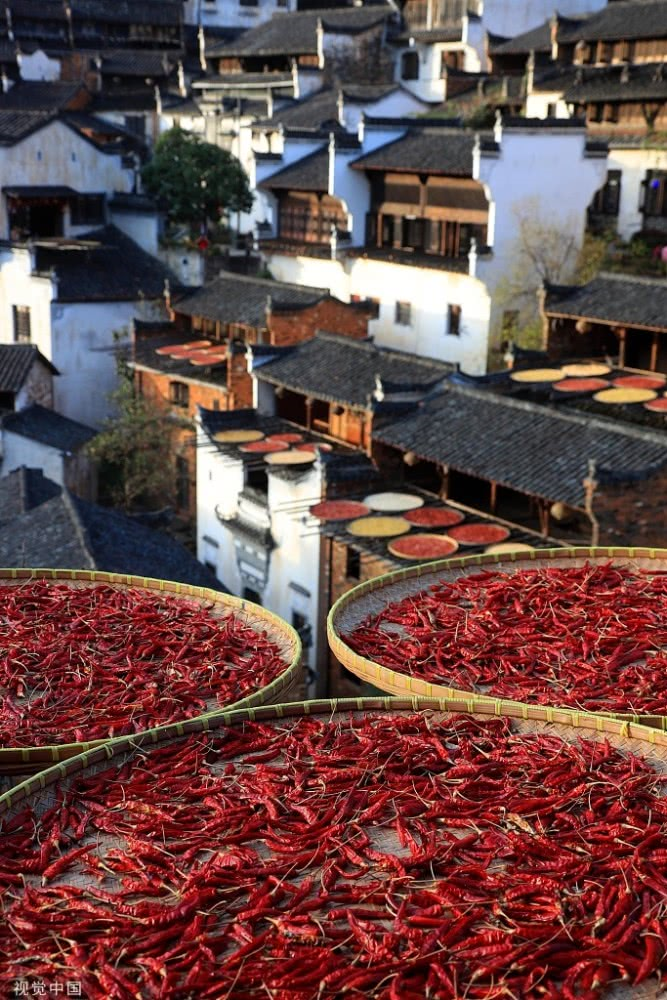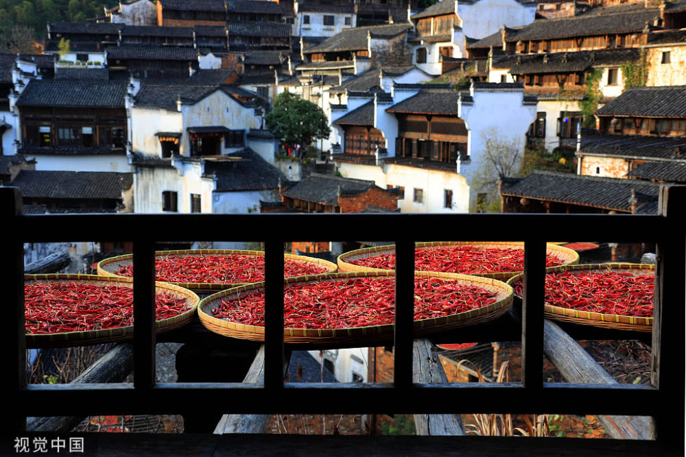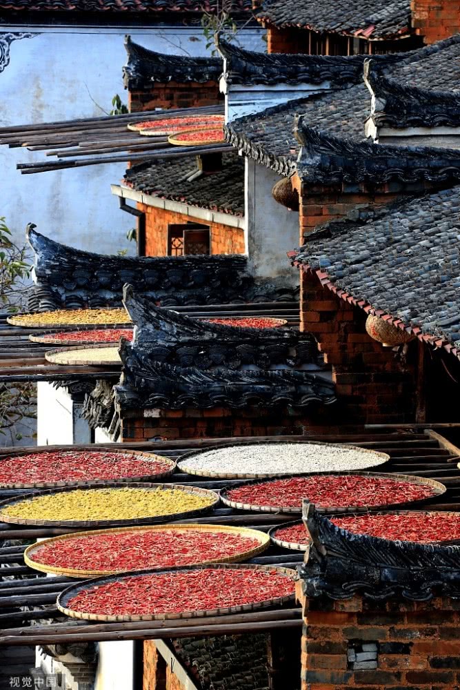 秋天,是收获的季节。安徽省黄山市呈坎古村村民将收获归仓的玉米、黄豆、红辣椒等农作物果实因地制宜晾晒,在古村晒场上描绘出一幅丰收晒秋图。