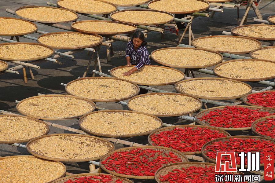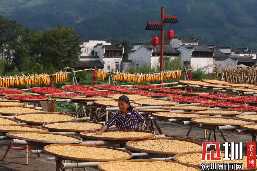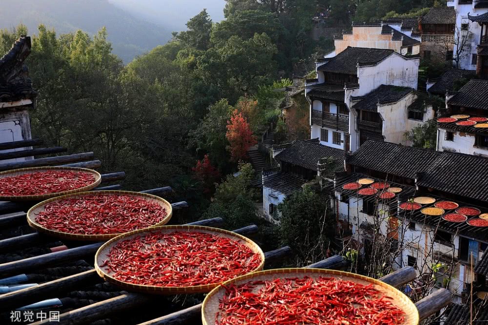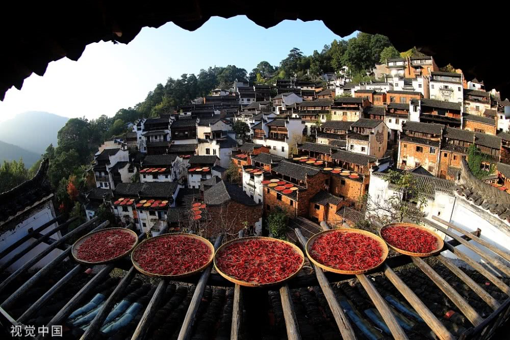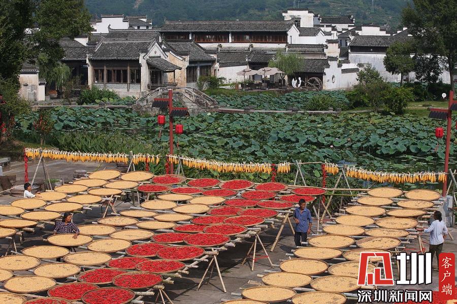 秋天,是收获的季节。安徽省黄山市呈坎古村村民将收获归仓的玉米、黄豆、红辣椒等农作物果实因地制宜晾晒,在古村晒场上描绘出一幅丰收晒秋图。