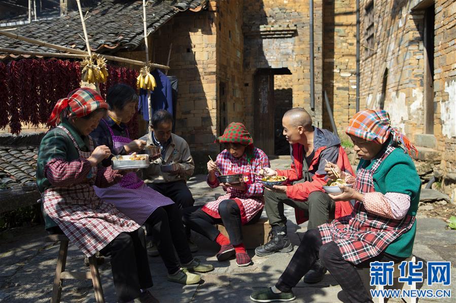 曹加祥(右二)和篁岭景区的工作人员一起吃午饭(11月6日摄)。新华社记者张浩波摄