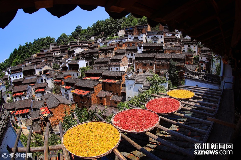 色彩斑斓的圆圆的晒匾,与依山而建的徽派古民居交相辉映,炫彩夺目。