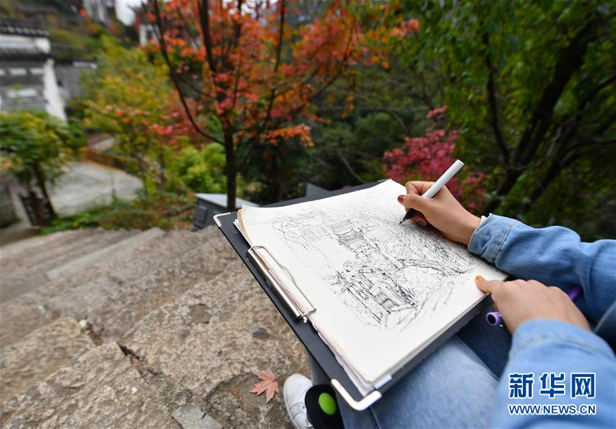 游客在婺源县江湾镇篁岭村写生(11月7日摄)。新华社记者胡晨欢摄