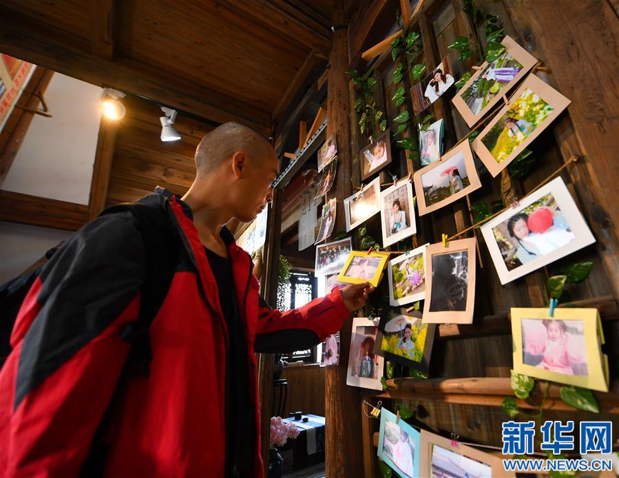曹加祥在篁岭村的摄影吧内欣赏其他游客拍摄的图片(11月6日摄)。新华社记者胡晨欢摄