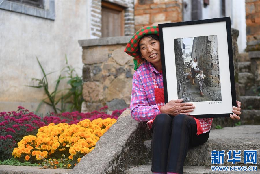 篁岭村村民曹细香拿着2010年自己的老照片在家门前留影(11月7日摄)。新华社记者胡晨欢摄