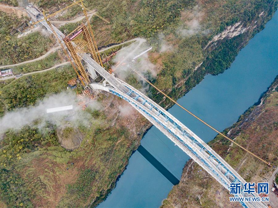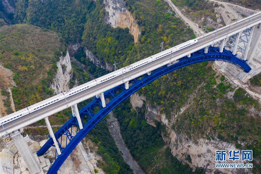 12月2日,一辆试验列车驶过成贵高铁鸭池河特大桥。当日,正在进行联调联试的成贵高铁进入全线拉通空载模拟运行阶段,试验列车将在成都到贵阳区间内全线路运行。线路全长650公里的成贵高铁是我国“八纵八横”高速铁路网的重要组成部分,设计时速为250公里。新华社记者刘续摄
