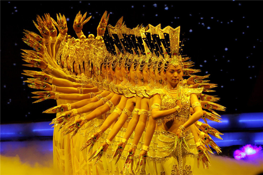 2009年11月26日晚7时,感恩节当天,中国残疾人艺术团在沈阳市残疾人杂技团排练厅举办的以“爱的阳光”为主题的感恩晚会。中国残疾人艺术团团长邰丽华领衔表演《千手观音》。赵敬东/视觉中国
