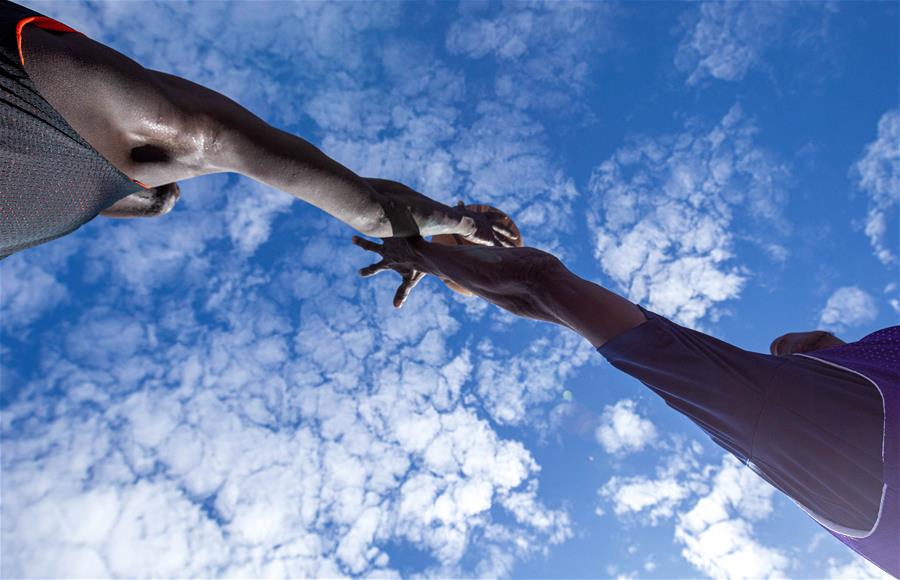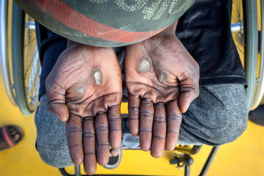 11月26日,在南苏丹朱巴篮球场,一名球员展示他的双手。新华社记者王腾摄