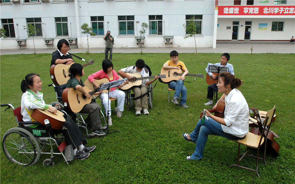 2009年4月25日,四川绵阳,“轮椅吉他队”队员的减少反而让盛雪老师很开心,因为坐在轮椅上的队员正在慢慢从音乐声中站起。常亮/视觉中国